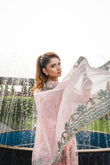 Radiate charm with Blush Grace, a luxury organza suit in a delicate blush pink tone, beautifully enhanced with fine thread embroidery and shimmering sequin work. Crafted with a premium silk inner for smooth comfort, the straight-cut shirt features intricate floral motifs and a heavily embellished hemline, while the matching embroidered borders add a refined touch. The lightweight organza dupatta, adorned with heavy embroidery along the edges, completes this feminine and graceful look β perfect for weddings, engagements, and festive celebrations.
